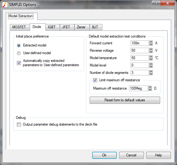 The default test conditions for the Extract Diode Parameters dialog can be set from the Command Shell menu File|General|SIMPLIS Options....